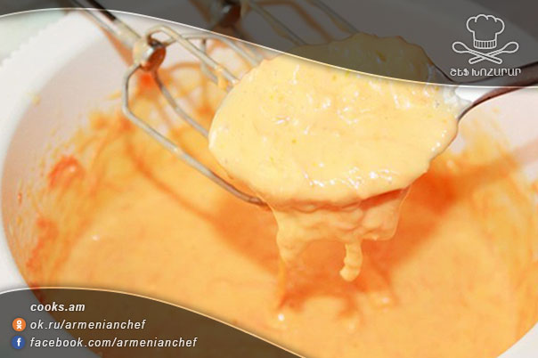 րոպե թխում ենք։ Բիսկվիթը սառեցնում ենք և 2 մասի բաժանում։ - Պատրաստում ենք կրեմը։ Նարնջի հյութը քամում ենք։ Այս թխվածքի մեջ օգտագործում ենք միայն թարմ քամած հյութը։ 660մլ բաժակ հյութ ստանալու համար 3 հատ մեծ նարինջ է հարկավոր։