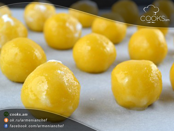 - Գնդիկները դնում ենք յուղաթղթապատ ձևամանի մեջ: Թխում ենք 20-30 րոպե 180 աստիճան տաքացրած ջեռոցում: