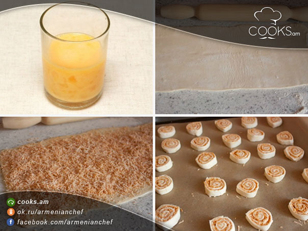 Սեղանին ալյուր ենք ցանում և սենյակային ջերմաստիճանի շերտավոր խմորն ուղղանկյունաձև գրտնակում ենք: Խմորին քսում ենք ձուն, լցնում միջուկը, զգուշությամբ ռուլետանման փաթաթում, ծածկում պոլիէթիլենային թաղանթով և 10 րոպեով տեղափոխում ենք սառցախցիկ:
