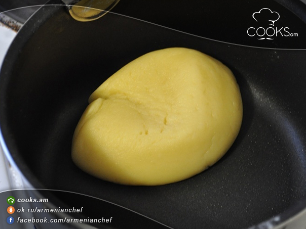 - Պատրաստում ենք եփովի խմորը: Կարագը, շաքարավազն ու աղը լցնում ենք կաթսայի մեջ, ավելացնում կաթն ու ջուրը: Խառնուրդը դնում ենք կրակին և եռացնում: Հենց որ այն սկսում է եռալ, կրակից վերցնում ենք, ավելացնում մաղած ալյուրը և արագ-արագ խառնում, մինչև ստացվի համասեռ զանգված: Խմորը նորից դնում ենք կրակին ու խառնում: Հենց որ խմորը սկսում է կպչել կաթսայի պատերին, վերցնում ենք: