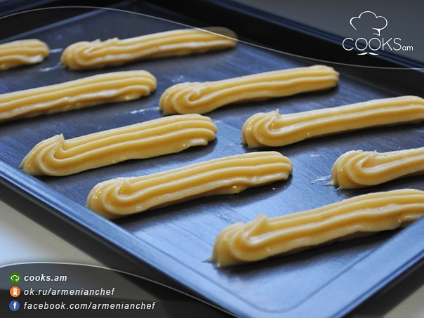 - Այնուհետև 10-12 սմ երկարությամբ ու 2 սմ լայնությամբ լցնում ենք տապակի մեջ (բավականաչափ արանքներ թողնելով) և թխում տաքացրած ջեռոցում 30-40 րոպե: