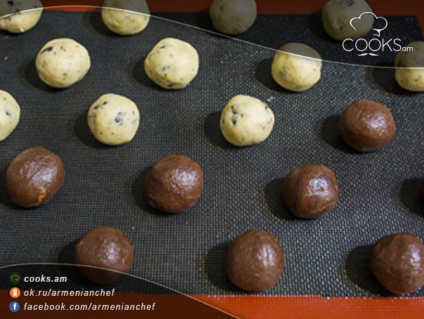 - Օսլան ու ալյուրն անցկացնում ենք մաղով, ավելացնում ենք մանր կտրատած շոկոլադի կտորներն ու աղը և ստանում ենք խմորագունդ: Այն բաժանում ենք երկու հավասար մասերի, որոնցից մեկին ավելացնում ենք կակաոյի փոշին ու ստանում շոկոլադե խմորագունդ: