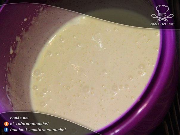 - Ձվի դեղնուցները շաքարավազի հետ հարում ենք, ավելացնում ենք կաթն ու բուսայուղը։ Ամեն ինչ լավ հարում ենք մինչև համասեռ զանգված ստանանք։ Դեղնուցներով զանգվածը լցնում ենք ալյուրով խառնուրդի մեջ։ Թիակով կամ գդալով լավ խառնում ենք մինչև միասեռ զանգված ստանանք։ Այնուհետև խմորի մեջ ենք լցնում սպիտակուցները։ Սպիտակուցները խմորի հետ զգուշորեն խառնում ենք։ Խմորը շատ թանձր չի լինի, կարելի է ասել ծորացող խմոր կստանանք։
