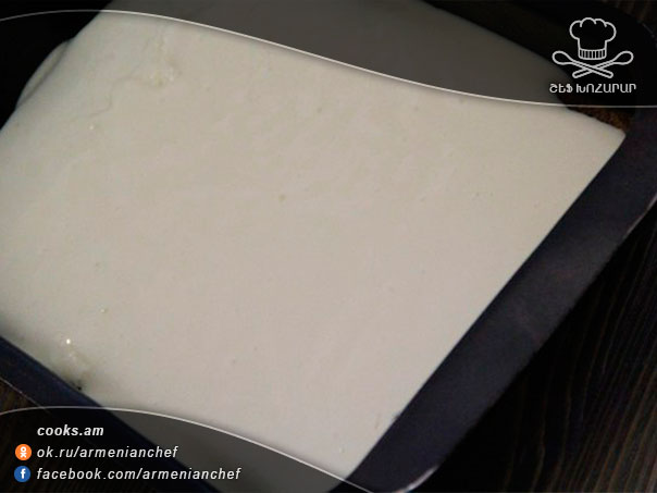 - Պատրաստի շերտը սառեցնում ենք և 2 շերտի կիսում։ Կաթնային պատառները ևս պատրաստում ենք այն ձևամանի մեջ, որտեղ թխվել է շերտը։ Ձևամանի մեջ ենք դնում առաջին շերտը, վրան ենք լցնում սուֆլեով զանգվածը:
