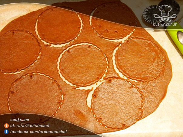 - Խմորը հանում ենք սառնարանից, գրտնակում 1 սմ-ից ավելի բարակ շերտով և 9 սմ տրամագծով շրջաններ կտրում։
