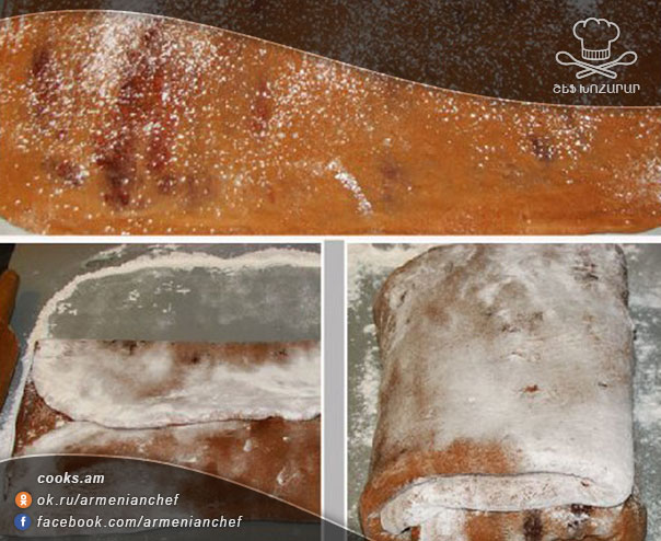- Վերցնում ենք խմորը և ալյուր ցանած մակերեսի վրա գրտնակում` մինչև 1սմ հաստությամբ ուղղանկյուն ստացվի։ Նորից կրկնում ենք 4 շերտ ստանալու գործընթացը և նորից դնում ենք սառնարանը։ Այս ամենը կրկնում ենք ևս երկու անգամ` ամեն անգամ չմոռանալով սառնարանում թողնել 20 րոպե։