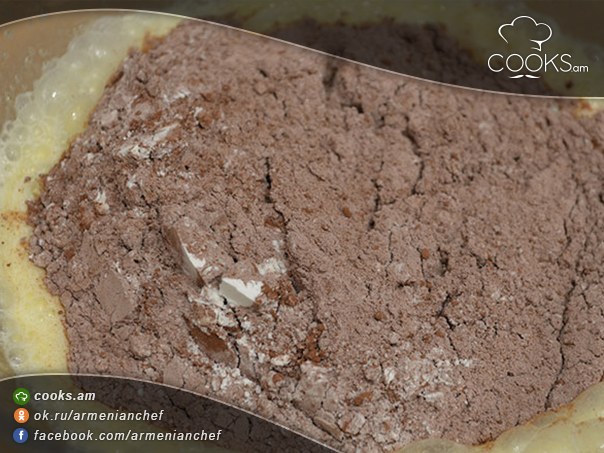 - Ամանի մեջ խառնում ենք ալյուրը, փխրեցուցիչն ու կակաոն: Ավելացնում ենք ձվերը, կաթը, շաքարավազն ու կարագը: