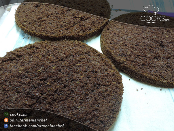 - Թողնում ենք, որ բիսկվիթը սառչի, ապա բաժանում ենք երեք խմորաշերտի։