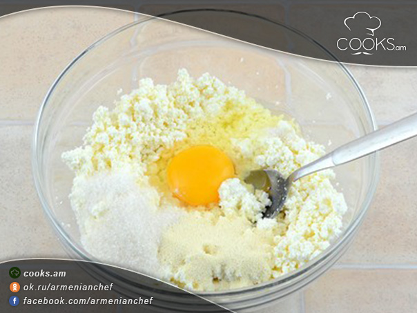 - Պատրաստում ենք շոռաբլիթները, որի համար կաթնաշոռը պատառաքաղով լավ տրորում ենք։
