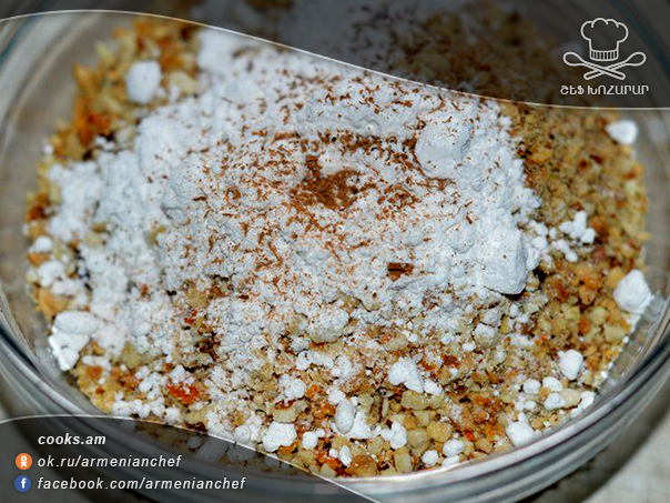 - Ընկուզեղենը խառնում ենք նարնջի կեղևի ու դարչնի հետ և լավ փշրում: Ավելացնում ենք շաքարի փոշին ու խառնում: