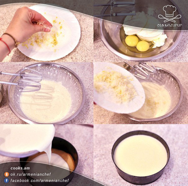 - Պատրաստում ենք միջուկը: Կիտրոնի կեղևը շաքարավազի հետ ձեռքով տրորում ենք և որոշ ժամանակով թողնում։ Պանիրը դնում ենք ամանի մեջ, ավելացնում ենք ձվերը, դեղնուցը, սերուցքը, վանիլինը և դանդաղ հարում ենք մինչև ստանանք համասեռ զանգված: Աստիճանաբար ավելացնում ենք կիտրոնի կեղևի հետ խառնած շաքարավազն ու ալյուրը։