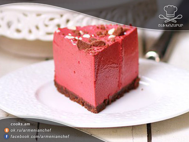 - Զանգվածը համասեռ դառնալուց հետո ավելացնում ենք գունանյութը և առանց շտապելու զգուշորեն խառնում ենք։ Ի դեպ, գունանյութի փոխարեն կարող ենք բազուկի հյութ խառնել` ժելատինի քանակը փոքր-ինչ ավելացնելով։ Այժմ թխվածքաբլիթներով հիմքը սառնարանից հանում ենք և պանրային զանգվածը զգուշորեն տարածում վրան։
