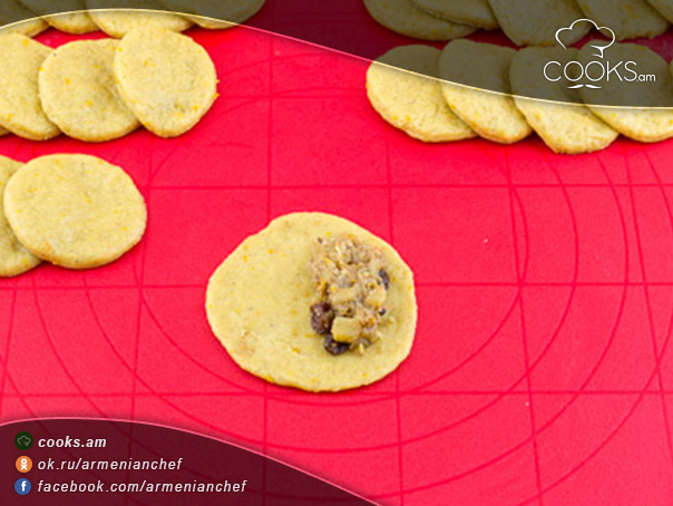 - Փոքրիկ խմորաշերտերի մի կողմում լցնում ենք միջուկը։