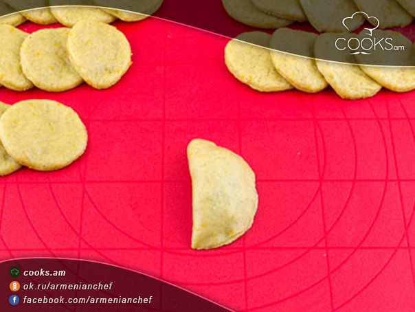 - Սեղանը պատում ենք ալյուրով, խմորը դնում ենք վրան ու փորձում ստանալ փափուկ, թեթևակի յուղոտ ու ձեռքերին չկպչող խմոր։ Ստացված խմորը բացում ենք ու բաժակի օգնությամբ փորձում ստանալ փոքրիկ շրջանակներ։