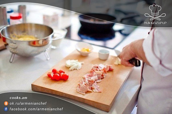 - Գլուխ սոխը երկարությամբ կտրատում ենք, բեկոնը մանր կտրում ենք, դեղնուցը`սպիտակուցից առանձնացնում, չերրի լոլիկը 2 մասի բաժանում։