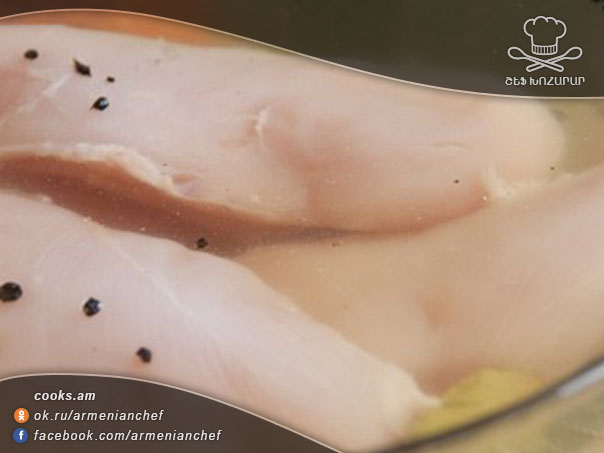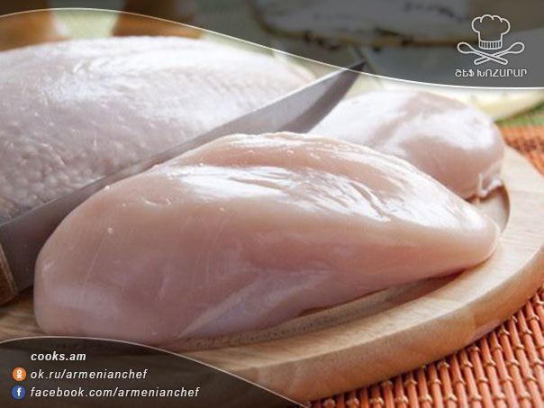 Հավի փափկամիսը լվանում ենք և 4 մասի կիսում։