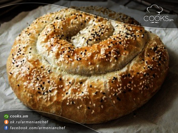 - Ջեռոցը 180 աստիճան տաքացնում ենք, տապակի մեջ յուղաթուղթ փռում, «խխունջը» շրջած դնում մեջը, որպեսզի գլանի կարը մնա ներքևում: Պիրոգի երեսին հարած ձու ենք քսում: