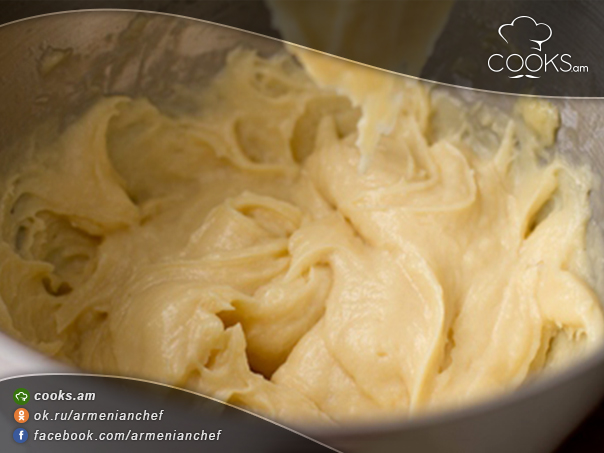 Կաթսան դնում ենք գոլորշու վրա և խառնելով հատ առ հատ ավելացնում ենք ձվերը: Խմորը չպետք է ջրիկանա: