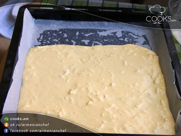 - Տապակի մեջ բուսայուղապատ թուղթ ենք փռում և օմլետի խմորը լցնում մեջը: