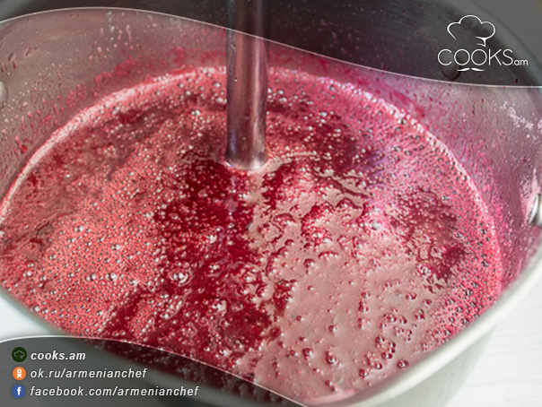 - Ստացված զանգվածը կրակի վրայից հանում ու բլենդերով հարում ենք՝ վերածելով միասեռ զանգվածի։