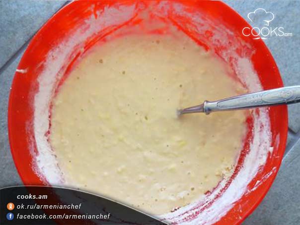 - Կամաց-կամաց ավելացնում ենք ալյուրն ու խառնում ենք: