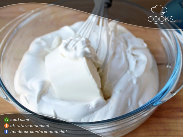 - Պատրաստում ենք կրեմը: Մնացած սերուցքն ու 100 գր շաքարավազը լավ հարում ենք, ավելացնում մասկարպոնեն: