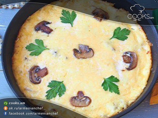 - Սնկերն ու սոխը բուսայուղով տապակում ենք: Կաթի մեջ մաղում ենք ալյուրը, ավելացնում աղն ու պղպեղը և լավ խառնում ենք: Լցնում ենք սնկերի վրա և մարմանդ կրակին եփում 10-15 րոպե: