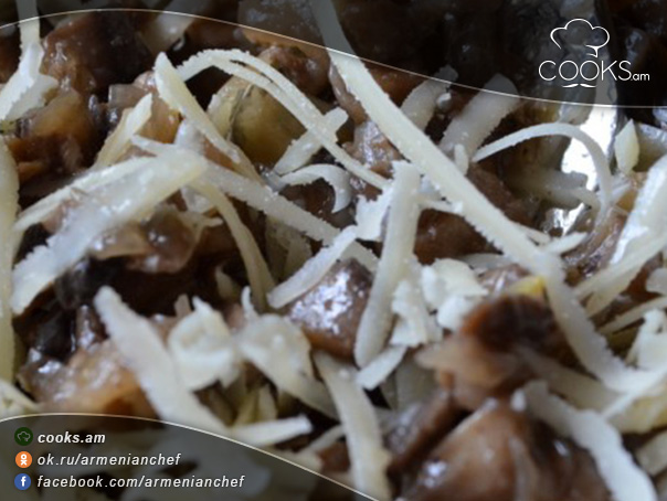 - Ավելացնում ենք սունկն ու տապակում ենք սոխի հետ։ Մոտ 20 րոպե տապակելուց հետո համեմում ենք աղով, պղպեղով ու խառնում ենք։ Ստացված զանգվածը լցնում ենք առանձին տարայի մեջ ու թողնում, որ սառչի։