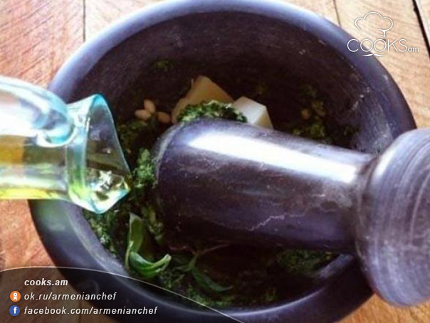 - Ավելացնում ենք ձիթապտղի յուղը, ընկույզը, քերած պանիրն ու սխտորը և շարունակում ենք ծեծել մինչև ստացվի միասեռ զանգված: