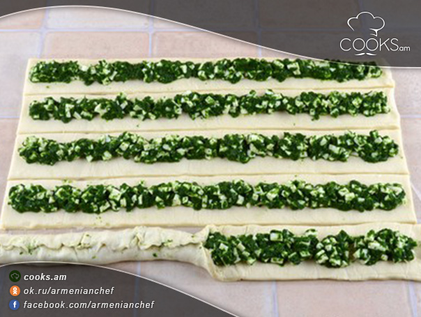 - Խմորը դուրս ենք բերում սառնարանից, բացում ենք խմորը՝ բաժանելով 5-6 սմ լայնությամբ շերտերի։