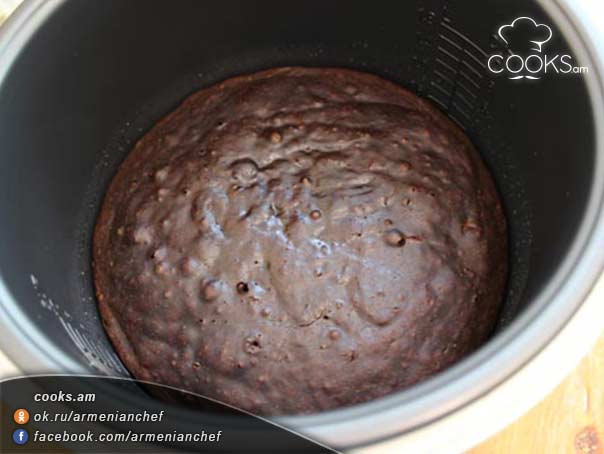 - Մուլտիվարկան պատում ենք բուսայուղով, լցնում ենք խմորն ու 65 րոպե եփում: