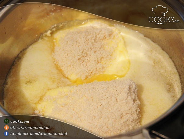 - Ստացված զանգվածը թողնում ենք, որ սառչի, ապա ավելացնում ենք չոր կաթը: Ստացվում է պինդ զանգված: