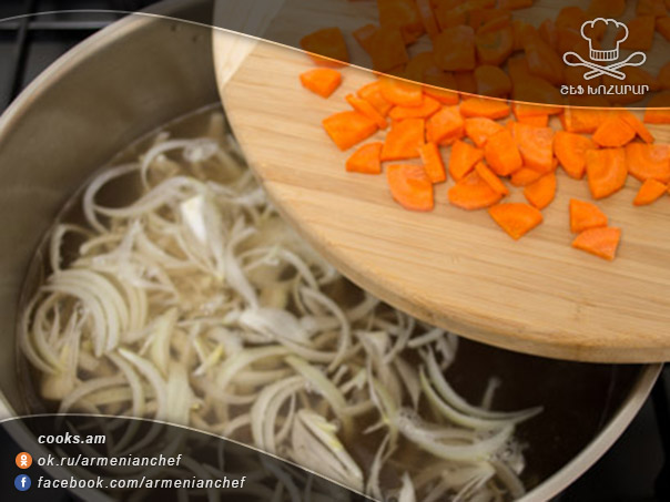 - Այնուհետև ավելացնում ենք գազարը։ 30 րոպե եփում ենք, մինչև գազարն ու սոխը ամբողջությամբ փափկեն։