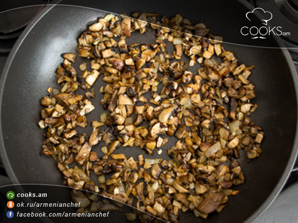 - Լցնում ենք մանր կտրատած շամպինիոնները, տապակում այնքան, մինչև արտազատված ողջ հեղուկը գոլորշիանա: Հետո ավելացնում ենք ճզմած սխտորը, առատ աղ ու պղպեղ ցանում: