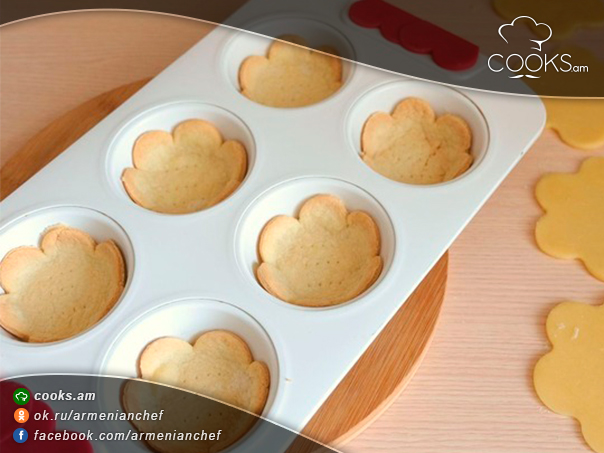 - Ձևավորված շերտերը դասավորում ենք կեքսերի համար նախատեսված ձևամանների մեջ, շերտերի ներքևի հատվածում պատառաքաղով մի քանի անցքեր ենք անում և թխում: