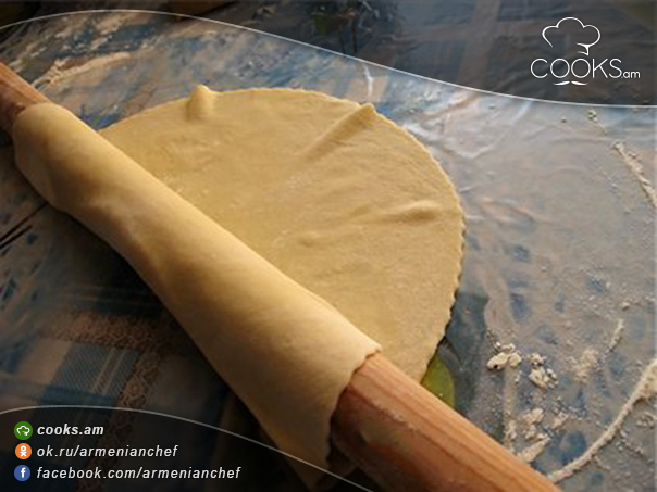 - Խմորը փաթաթում ենք գրտնակի վրա, որպեսզի թավայի մեջ տեղափոխելը հեշտ լինի: