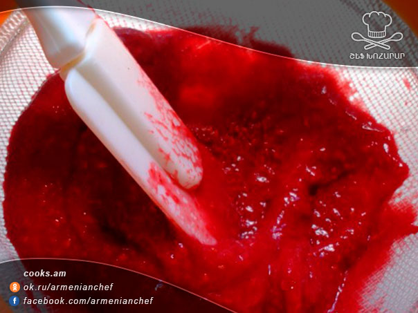 Այնուհետև լցնում ենք 20 սմ տրամագծով ձևամանի մեջ և տեղափոխում սառնարանը` մինչև պնդանա։ Լավ կլինի սիլիկոնե ձևաման վերցնել, որպեսզի փափուկ մարմելադը հեշտ դուրս գա։ Սակայն կարող ենք նաև բացվող ձևաման վերցնել, ամբողջությամբ պատել բուսայուղով, այնուհետև տակը սննդային փաթեթ դնել, իսկ կողքերը սննդային թաղանթից 4-5 սմ լայնությամբ ժապավեններ փռել, որոնք բուսայուղապատ ամանին լավ կկպչեն։ - Պատրաստում ենք ազնվամորու ջնարակը։ 150 գր ազնվամորին և 25 գր շաքարի փոշին բլենդերով հարում ենք մինչև խյուսանման զանգված ստանանք, այնուհետև անցկացնում ենք մաղով, որպեսզի հատիկներ չմնան, որից հետո թույլ կրակի վրա մինչև 40 աստիճան տաքացնում ենք։