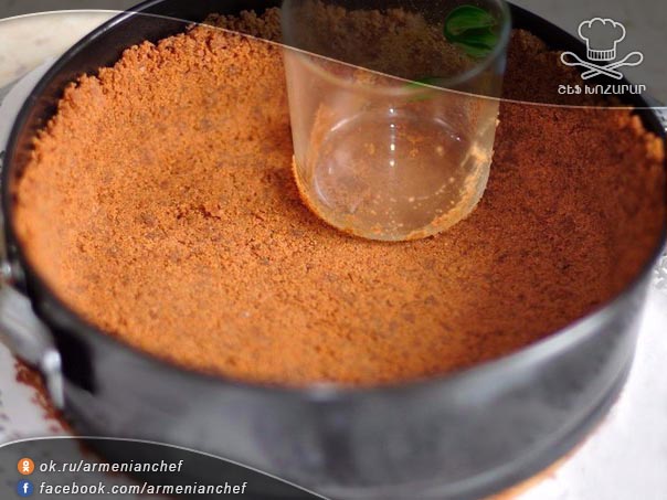 - Բլենդերում մանրացրեք թխվածքաբլիթները, ավելացրեք հալեցրած կարագը և լավ խառնեք: Մոտ 22սմ տրամագծով ձևամանը պատեք բուսայուղով, ապա լցրեք այնտեղ մանրացված թխվածքաբլիթները և, բաժակի օգնությամբ լավ սեղմելով, տարածեք այն ձևամանի հատակին և պատերին 6-7սմ բարձրությամբ: Տեղափոխեք սառնարան 30րոպեով: