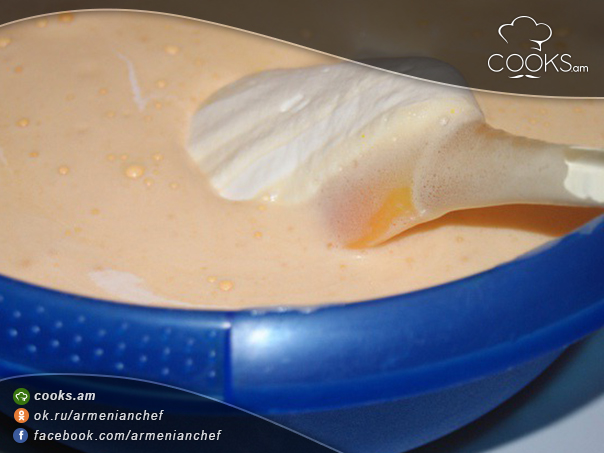 Սենյակային ջերմաստիճանի 6 ձուն շաքարավազի հետ հարում ենք առնվազն 7 րոպե, մինչև որ ծավալը 3 անգամ ավելանա: Հարած ձվերը, ժելատինով նարնջի հյութն ու սերուցքը խառնում ենք: