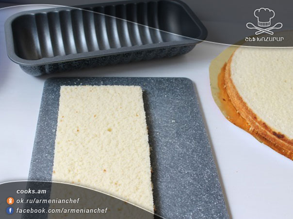 - Բիսկվիթը դնում ենք, թեթևակի սեղմում և 3 ժամով տեղափոխում սառցախցիկի մեջ։