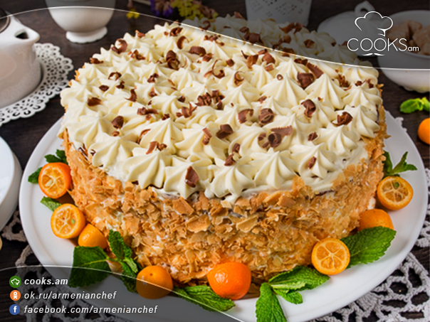 - Շերտերի վրա կրեմ ենք քսում և լցնում քերած շոկոլադը: Շերտերը դնում ենք միմյանց վրա և վերևն ու կողքերը կրեմապատում: Զարդարում ենք ըստ ճաշակի: