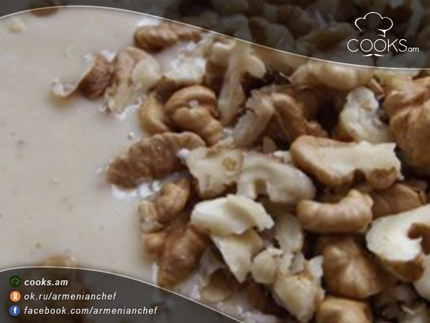 - Առանձին էմալապատ կաթսայում տաքացնում ենք նախատեսված կարագի կեսը: Թողնում ենք՝ հովանա, ավելացնում ենք թթվասերն ու լավ խառնում: