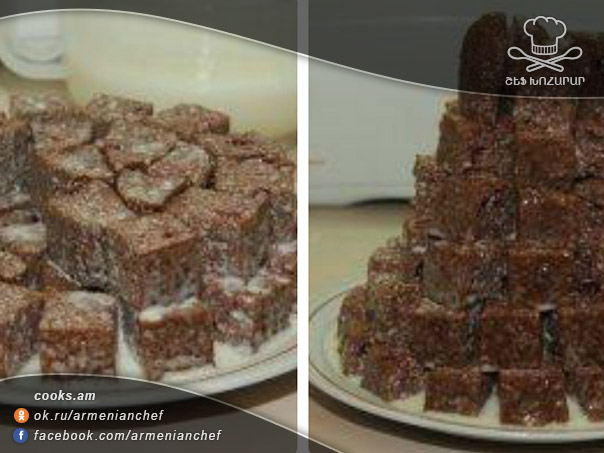 - Աղյուսաձև կտրատած բիսկվիթները կրեմի մեջ թաթախում ենք և կլոր ամանի մեջ բրգաձև շարում։ Շարում ենք մինչև բիսկվիթի կտորները վերջանան։ 4 ճ/գդ կրեմ ենք թողնում, որպեսզի վերջում լցնենք տորթի վրա։