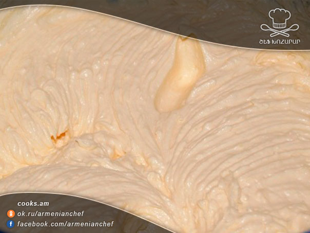 - Պատրաստում ենք եփովի կրեմը: Դեղնուցները 60 գր շաքարավազի հետ տրորում ենք, ավելացնում ենք վանիլինը, 1 ճ/գդ ալյուրը, կաթը և զանգվածը լավ խառնում ենք, որպեսզի գնդիկներ չմնան, այնուհետև դնում ենք թույլ կրակի վրա և, անընդհատ խառնելով, եփում ենք՝ մինչև պղպջակներ առաջանան և զանվածը թանձրանա: