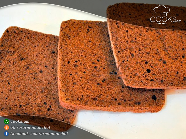 - Պատրաստում ենք բիսկվիթը: Սպիտակուցներն ու դեղնուցներն առանձնացնում ենք, սպիտակուցները շաքարավազի կեսի հետ հարում այնքան, մինչև ստացվի խիտ փրփուր: Դեղնուցները վանիլինի ու մնացած շաքարավազի հետ հարում ենք մինչև սպիտակելը: Այնուհետև սպիտակուցներն ու դեղնուցները խնամքով միացնում ենք իրար: Ալյուրը խառնում ենք կակաոյի, փխրեցուցիչի ու օսլայի հետ և մաղում ձվային զանգվածի վրա: Խնամքով խառնում ենք այնքան, մինչև ստացվի համասեռ զանգված: Ձևամանի մեջ յուղաթուղթ ենք փռում և խմորը լցնում մեջը: