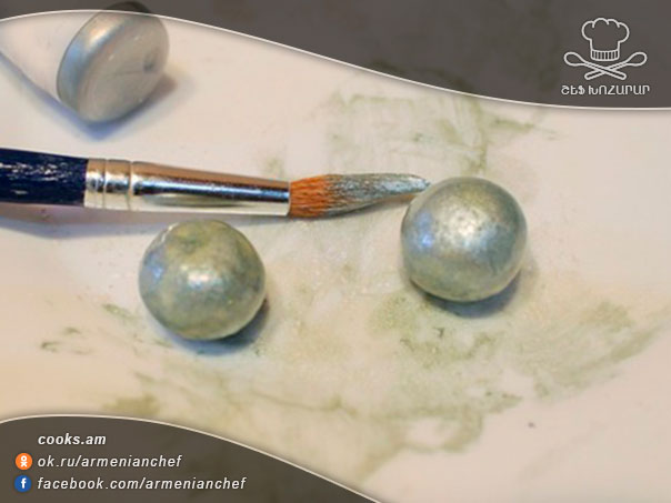 - Այժմ նախապատրաստում ենք մաստիկան. մաստիկան կամարաձև բարակ շերտով կտրում ենք։ Մաստիկայից 2 հատ գնդիկ ենք սարքում և գելային գունանյութով ցանկացած գույնով ներկում։