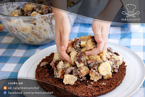- Ներքևի շերտը դնում ենք ափսեի վրա(որպես տորթի հիմք), իսկ երկրորդ շերտը