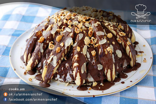 - Մնացած հալած շոկոլադով պատում ենք տորթը և վրան շաղ ենք տալիս մանրացված