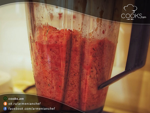 - Տորթը պահում ենք սառնարանում ու պատրաստում ենք սուֆլեն, որի համար հնդկական ընկույզը բլենդերով մանրացնում ենք, ավելացնում ենք կոկոսի յուղը, մեղրը, ազնվամորին, վանիլինն ու ջուրը և բլենդերով հարում ենք։