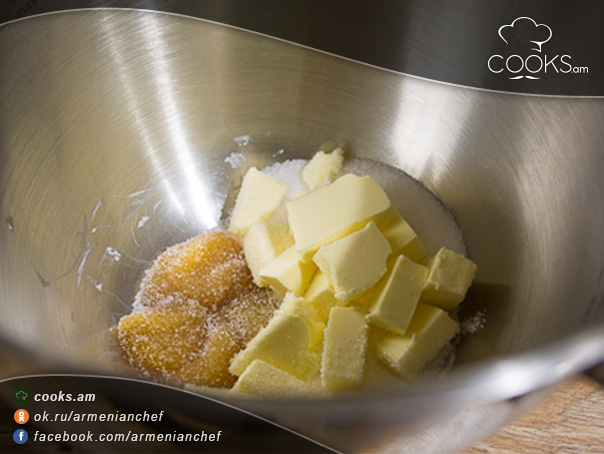- Պատրաստում ենք խմորը: Խառնում ենք մեղրը, շաքարը և կարագը, ամանը դնում եռացող ջրով լի կաթսայի մեջ: